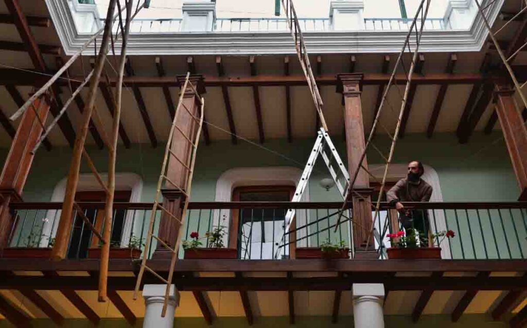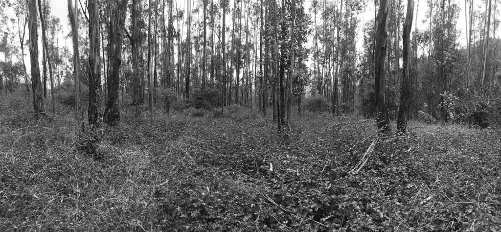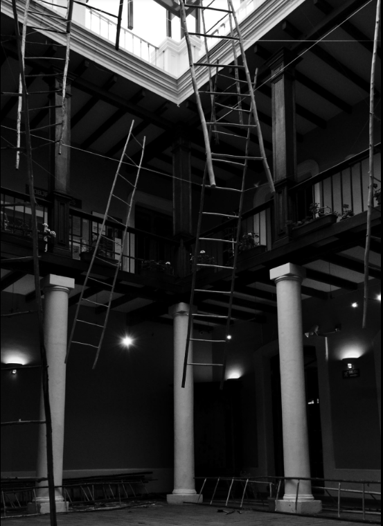Plantear un desplazamiento al vano, al umbral, al intersticio: en el mundo funcional que llevamos siglos construyendo para agudizar la neurosis de la productividad, la emergencia de un espacio -el patio de una casa que es un museo que es un archivo que es un plano- lleno de frágiles estructuras que no llevan a ninguna parte. La propuesta es -para no usar la manida y por lo general exagerada palabra revolucionaria- provocadora, sugerente, evocativa. Estas escaleras no llevan a ninguna parte. Tampoco tolerarían el peso de ninguna persona, y para su construcción no se emprendieron las capitalistas tareas de la tala y la alienación de la materia en su plusvalía. Más bien, como recolectores de épocas perdidas, extintos como los animales que habrán sido testigos de esos cuerpos ocupados en la observación de los suelos y los cielos, los imaginadores de esta instalación fueron recogiendo ramas caídas de eucalipto y con ellas crearon escaleras para fantasmas: frágiles, inconducentes, quebradizas tal vez -no lo sabremos-, solitarias.